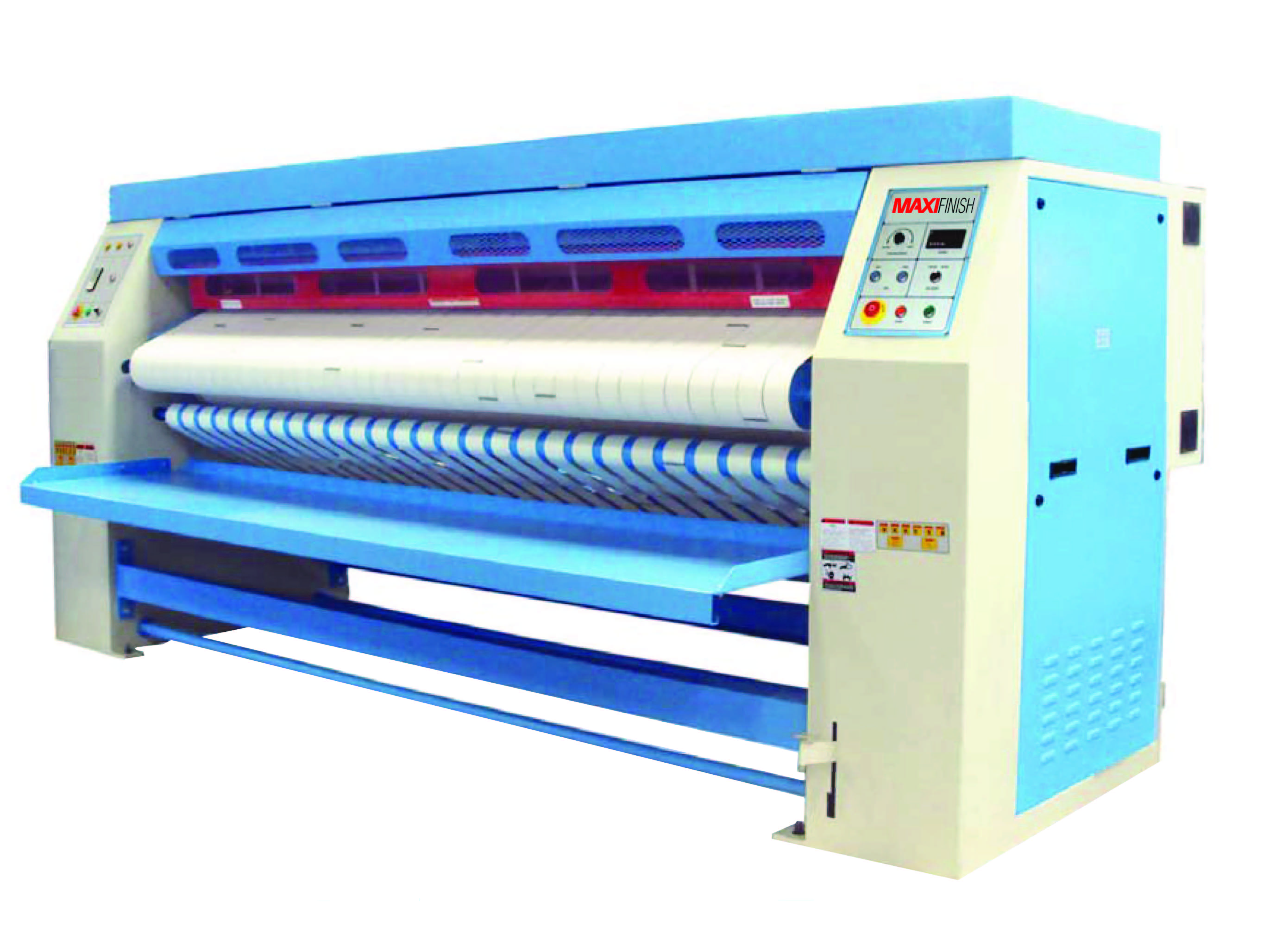 Ironer with Feeder, Folder and Stacker, Roller diameter 32 inch (800 mm), Roller Length: 120 inch (3000 mm), PLC touch screen control, Speed adjustable, Feed / Iron / Fold in a single machine, Single lane for large pieces, Automatic operation, 2 lengthfolds and 3 crossfolds for large pieces, 2 length folds and 2 crossfolds for small pieces, Drop stacker, speed range 2-22 m/min, Available in Steam, Electric and Gas Heating